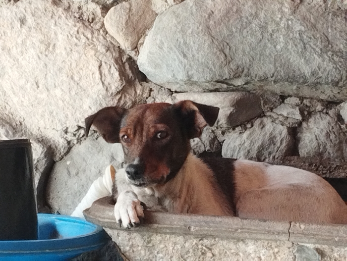 A brown and white mixed-breed dog, appearing to be a terrier-type, is observed resting on a grey concrete ledge or trough. Its right front leg is bandaged with white material. The dog's gaze is directed forward, towards the viewer. Behind the dog is a rough-hewn stone wall constructed from irregularly shaped, light grey rocks. To the left of the dog, a blue plastic bucket or container is partially visible, containing a dark, possibly black, object. The scene is located in a semi-sheltered area within Guacara, Venezuela, under diffused ambient lighting.