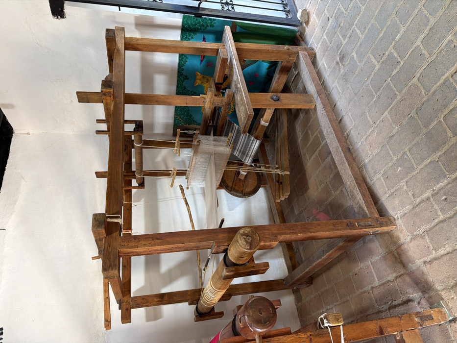 A wooden loom stands against a white wall and a brick wall