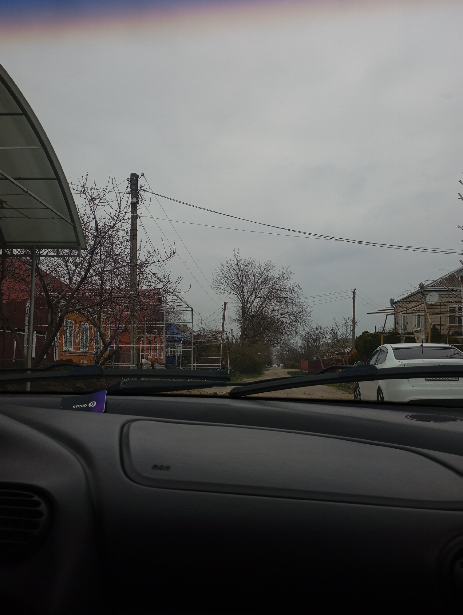 The image presents a forward-facing view from inside a vehicle on an unpaved road in Kurganinsk, Russia, under an overcast sky. The vehicle's dark dashboard is visible in the foreground, with two windshield wipers partially obscuring the view and a purple "GRASS" branded item on the dashboard. To the left of the road, multiple residential buildings are visible, including a prominent two-story house with orange-brown siding and multiple white-framed windows, and a red-sided house further back. A metal frame structure, possibly a canopy, stands partially visible on the far left. Numerous leafless trees and sparse vegetation are present along the roadside. To the right of the road, a light-colored, possibly brick or stucco, residential house features a satellite dish mounted on its exterior. A white four-door sedan is parked in front of this house, facing away from the camera. Throughout the scene, multiple utility poles with overhead power lines are visible, extending along the road. The unpaved road recedes into the distance, where several faint, indistinct vehicles are discernible. No individuals are visible in the scene.