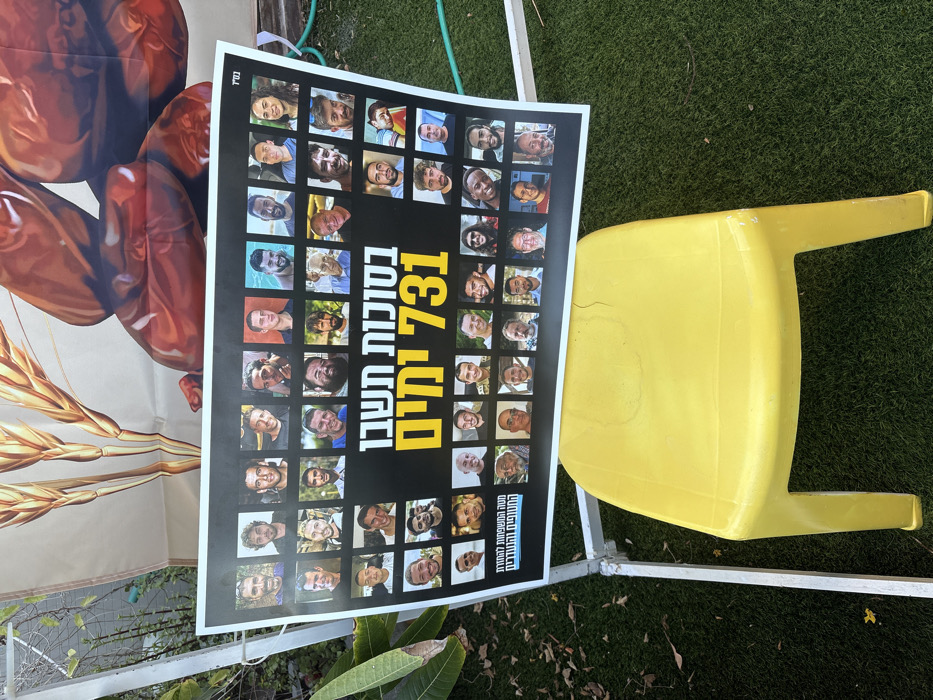 The image depicts an outdoor scene in Ramat HaSharon, Israel, featuring a large, vertically oriented poster mounted on a white tubular metal stand. The poster has a black background and displays a grid of 42 individual portrait photographs, predominantly of men of varying ages. Centrally located on the poster is large yellow Hebrew text that reads "בזכות השבו 731 ימים" (In their merit 731 days). In the lower-left corner, smaller white Hebrew text identifies "מטה המשפחות להחזרת החטופים והנעדרים" (The Hostages and Missing Families Forum). Directly in front of the poster, a single, worn yellow plastic chair is positioned, facing the display. The ground beneath the poster and chair is covered with artificial green turf, on which a few brown leaves are scattered. In the background, a larger fabric banner is visible, featuring illustrations of golden wheat stalks on the left and several brown dates on the right. Green foliage is present on the far left side of the frame.