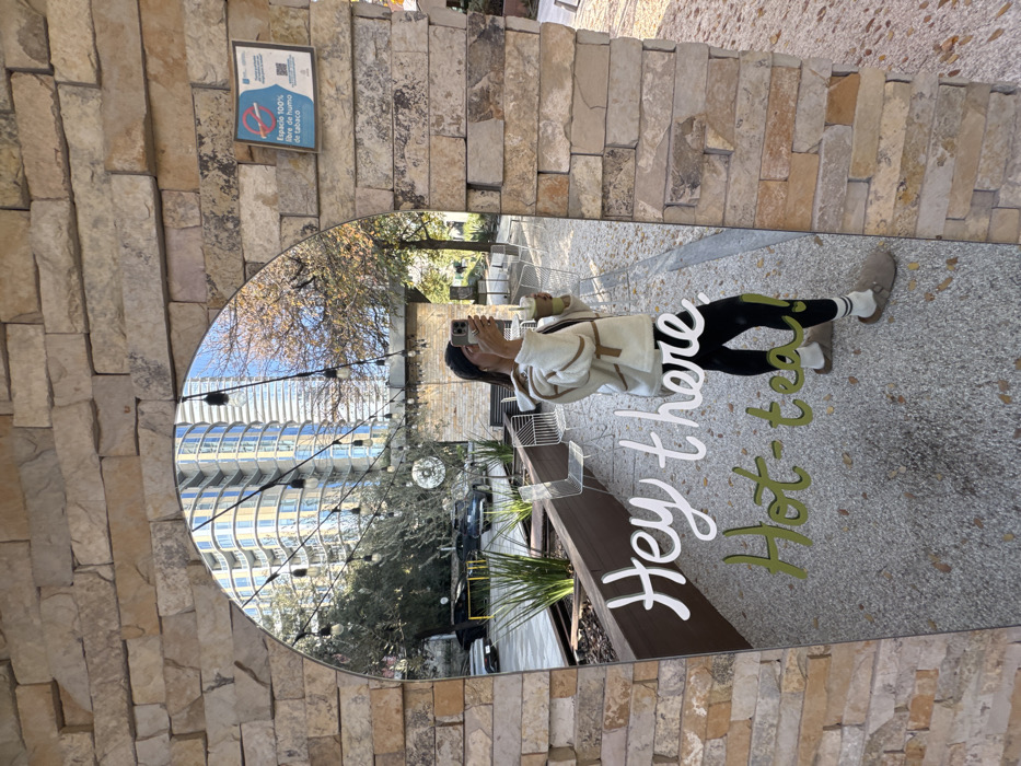 A mirrored display outside is mounted on a brick wall. A woman with black leggings and an off-white jacket, holding a phone, is reflected in the mirror. The surrounding area, including buildings and trees, is also visible in the reflection. The words "Hey there! Hot-tea!" are incorporated into the mirror design in white and green. A sign is affixed above the mirror to the wall.