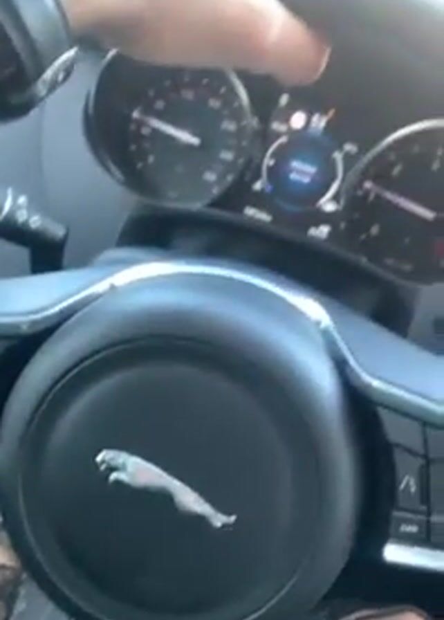 A person is driving a Jaguar sedan on a city street on a clear sunny day