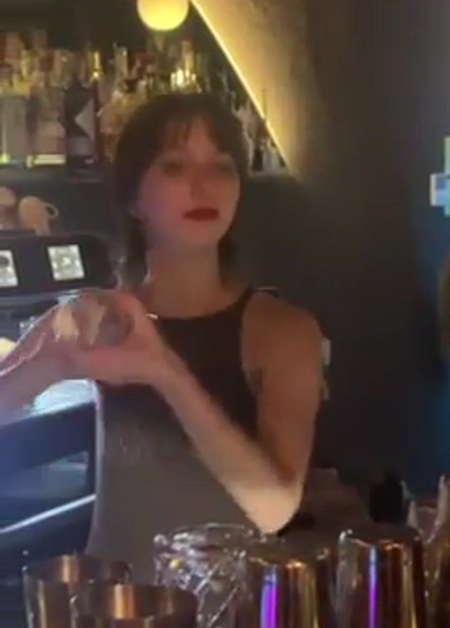 Here's a concise description of the video: The video shows a young woman with short, dark hair and red lipstick working as a bartender