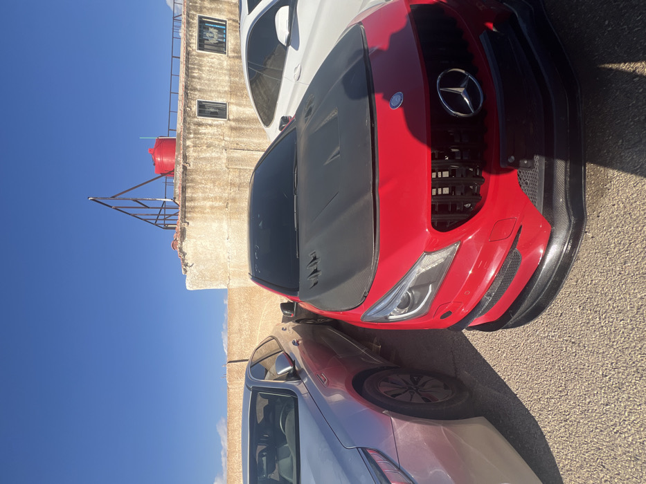 The image captures an outdoor scene in Jaber as-Sirhan, Jordan, under bright daylight with a clear blue sky. Three automobiles are parked on a textured asphalt surface. The primary subject, positioned centrally, is a red Mercedes-Benz sedan, likely a CLA model, featuring a black carbon fiber hood with integrated vents, a custom black front grille displaying a prominent Mercedes-Benz emblem, and a black lower front splitter. The front right section of this vehicle is partially obscured by shadow. To the immediate left of the Mercedes, a silver Kia Optima sedan is parked, with its front passenger side visible, including the headlight and a multi-spoke wheel. To the right of the Mercedes, a partial view of a white sedan's front passenger side is discernible. In the background, a weathered light-colored concrete wall extends horizontally. Above this wall, on what appears to be a rooftop, a red cylindrical water tank is visible alongside metal railings and two small windows fitted with security bars. No individuals are present in the depiction.