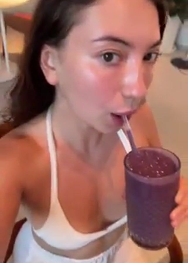 A woman is shown from the chest up. She is indoors, sitting at a table and drinking a purple beverage from a glass with a straw. She has dark hair, fair skin with a reddish tint, and is wearing a white top with straps. The background includes other tables, chairs, and people.