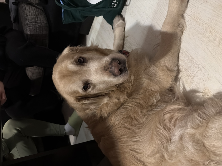 - "A light golden-furred Golden Retriever dog lies on a light-colored, plank-style floor" by FM-xDLKn1, licensed under CC BY 4.0