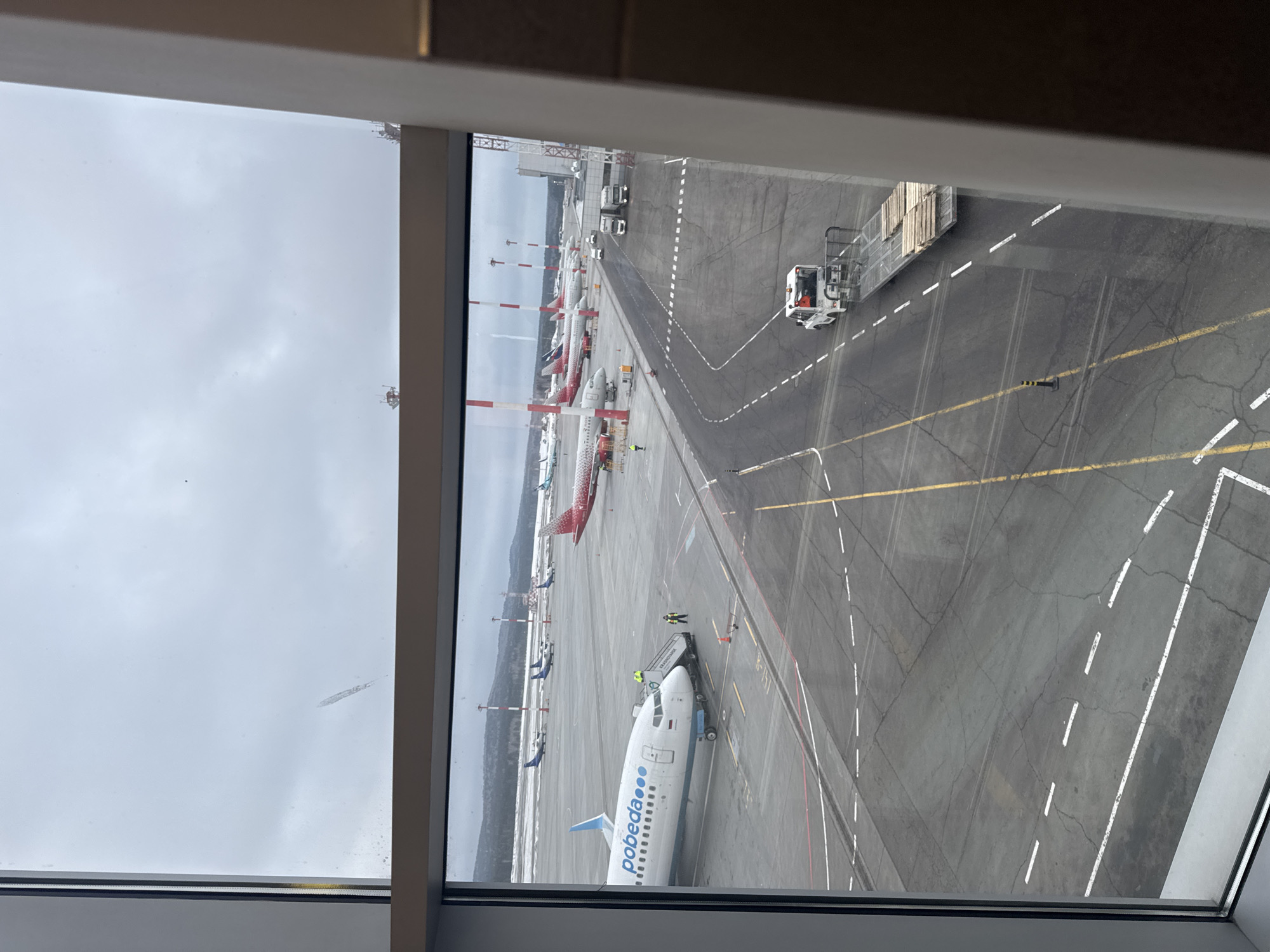 The image depicts an airport tarmac scene, viewed from an elevated position through a window, likely within a terminal building, located in Sukhaya, Russia. The sky is overcast and grey. In the left foreground, a white Boeing 737-800 aircraft belonging to "Pobeda" Airlines is parked, displaying its blue and white livery with the Russian flag near the cockpit. A mobile passenger stair unit is positioned at its front left door. Two individuals, one in a high-visibility yellow vest, are visible on or near these stairs, indicating ground operations. A ground power unit or similar equipment is near the aircraft's nose. The tarmac is asphalt, marked with various white and yellow lines, showing signs of wear and cracks. In the midground, to the right of the Pobeda aircraft, a white ground support vehicle, resembling a tug or baggage tractor, is visible, pulling a flatbed trailer laden with multiple wooden pallets. Further in the midground and background, numerous other aircraft are parked, including several with prominent red tailfins, likely belonging to Rossiya Airlines, and smaller blue-tailed aircraft. Red and white striped poles, possibly for lighting or markers, line the far edge of the apron. Distant snow-covered hills or mountains are visible on the horizon. A building structure and two white semi-trucks are parked further back on the right side of the tarmac. The window itself shows a prominent vertical smudge mark in the upper left quadrant.