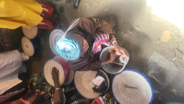 The scene depicts an informal vendor stall or market area in Fagge D1, Nigeria. A central female figure, viewed from an elevated perspective, crouches on a rough, dusty concrete or dirt floor. She wears a brown garment and a light blue head covering. Her hands are submerged in a clear plastic bucket containing small, dark, granular material, and she holds a small clear plastic bag, indicating an action of scooping or packaging. Light-colored bracelets are visible on her wrists. Surrounding her on the ground are multiple large, circular, woven baskets, primarily white with blue rims, some containing dark goods and small white plastic bags. Other individuals are partially visible: a person wearing a patterned garment with a gold bracelet is to the upper left; a person in white attire stands to the upper center-left; and a person wearing a yellow garment over red patterned trousers is to the upper right. The environment appears to be an active, open-air commercial space with strong overhead lighting casting subtle shadows.