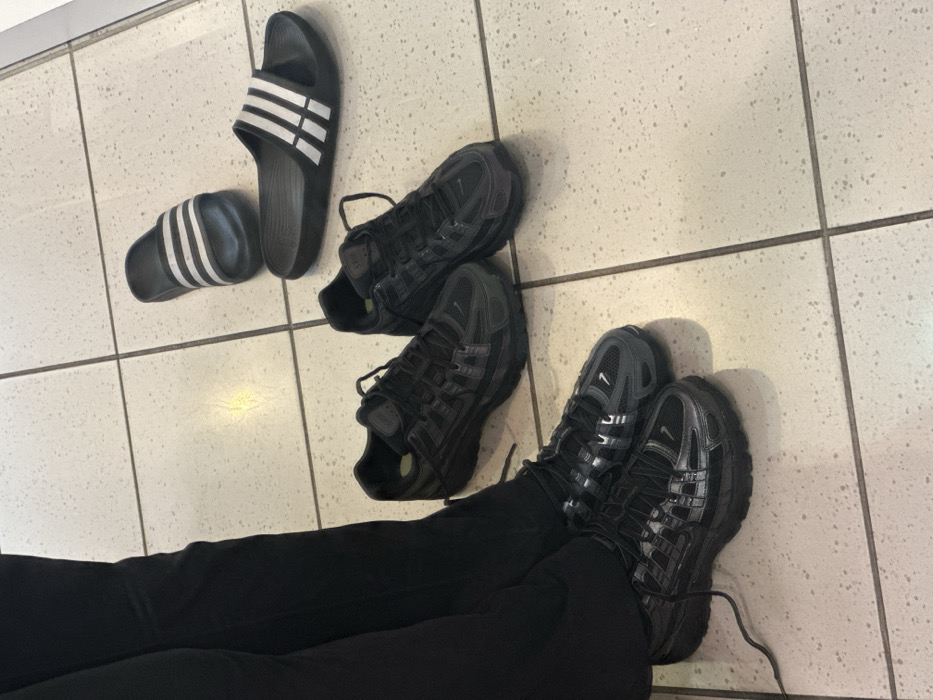 The scene, located in Tunbridge Wells, United Kingdom, depicts a lower body perspective on a light-colored tiled floor. A person, clad in black trousers, stands with both feet in a pair of dark grey and black athletic sneakers, identified as potentially Nike P-6000 models. The laces on the left sneaker are untied. Adjacent to the person's feet, a pair of black Adidas Adilette slide sandals, each featuring three prominent white stripes on the strap, rests on the tiled surface.