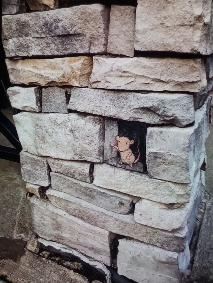 The image displays a section of a stone pillar or wall located in Aktash, Uzbekistan. The structure is composed of irregularly shaped, rough-hewn stone blocks in various shades of grey, beige, and light brown, stacked with visible mortar lines. Approximately centered vertically on one face of the structure, a dark, rectangular recess or niche is present between two larger stones. Within this niche, a painted depiction of a light brown mouse is visible. The mouse, rendered in a cartoon style, exhibits pink ears, nose, and paws, dark eyes, and a black tail extending to the right. Its left paw is raised in an upward and slightly forward gesture, implying it is emerging or gesturing from the opening. The base of the stone structure rests on a grey concrete or paved surface, which shows minor cracks and dark debris in the crevices where it meets the ground. A dark, angular object, possibly a metallic support or railing, is partially visible in the background to the left of the stone structure.
