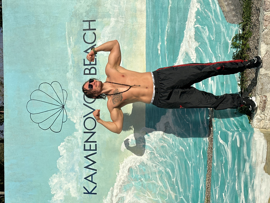 A shirtless man in sunglasses stands sideways, flexing his arms against a mural. The mural features a light blue background, the words "KAMENOVO BEACH" in dark letters, a seashell graphic, and a depiction of ocean waves. The man wears black track pants with red stripes and black sneakers. He also has a necklace and a tattoo on his left shoulder. The shadow of the man is visible on the ocean waves of the mural.