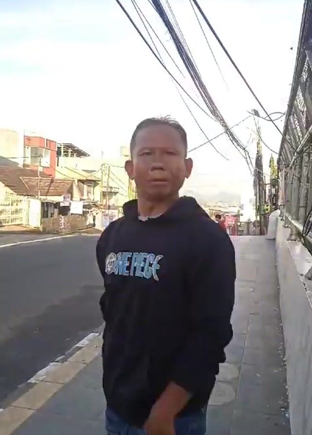 man standing on a sidewalk next to a road. He is wearing a black hoodie with "ONE PIECE" printed on it and blue jeans. He has short hair and is smiling. The sidewalk is made of gray tiles. There is a road next to the sidewalk with a green and yellow van parked on the side. There are buildings on the other side of the road, and power lines overhead. A man is visible sitting on a wall in the background. The sky is light blue.