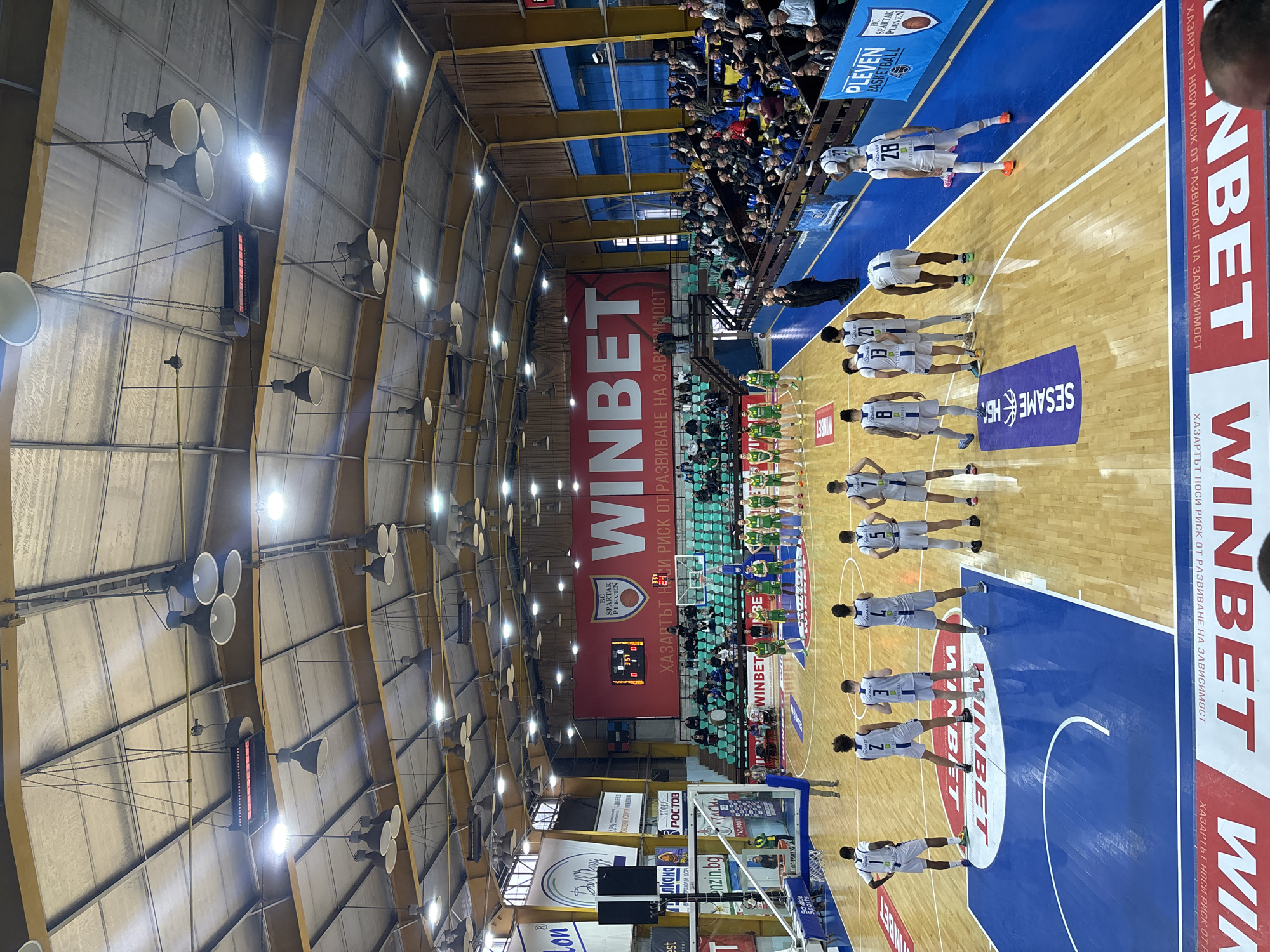 This is a vertically oriented shot of a basketball game indoors, likely in the city of Pleven, Bulgaria, given the "BC Spartak Pleven" branding