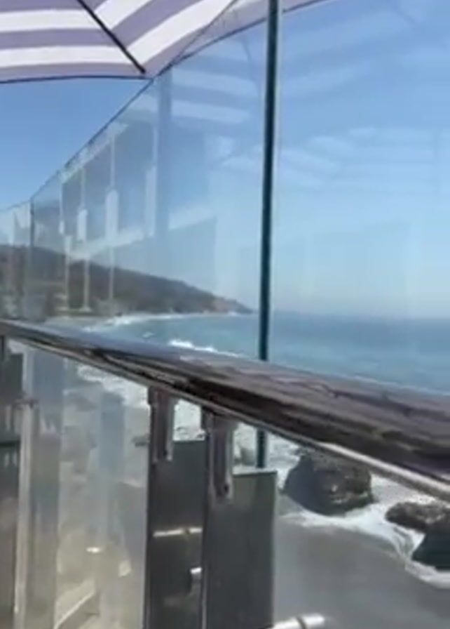 coastal scene with a view from a balcony or patio. A striped umbrella is partially visible overhead. A glass panel and metal railing run along the edge of the balcony. The focus is on the ocean waves crashing onto a beach with large rocks. The sky is blue and clear, and the water is a deep blue color. There are no people visible in the shot. The video appears to be taken during the day, likely in a sunny location.