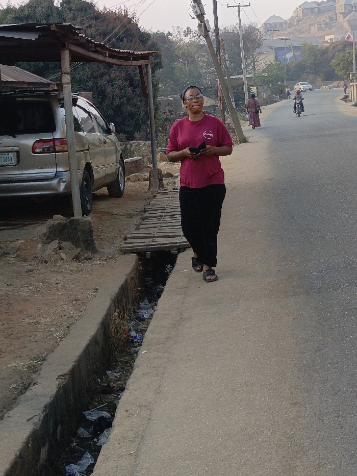 A woman in a burgundy shirt and black skirt walks down a road, looking at her phone. A silver minivan is parked under a makeshift shelter to her left. There's a drainage ditch filled with litter along the sidewalk. In the distance, a motorcyclist and pedestrian travel down the road, houses visible on a hillside. The lighting suggests it's either early morning or late afternoon.