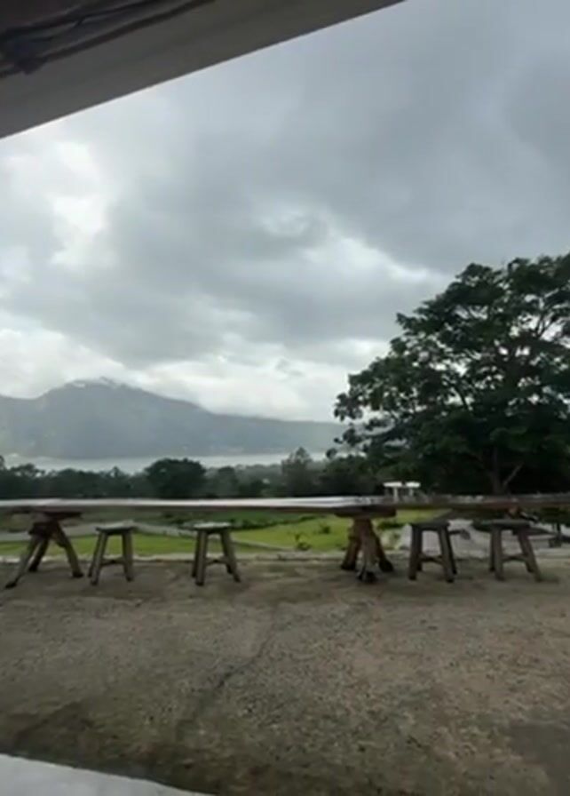 view from under a rustic, open-air structure with a thatched roof. In the foreground, there is a series of simple wooden tables and stools on a gravel-like surface. The camera pans slightly to the left, revealing an electric fan mounted on a wooden support beam. Beyond the seating area, there is a green field or meadow, followed by a body of water that could be a lake or bay. In the distance, a mountain is visible, partially obscured by low-hanging clouds. The sky is overcast, suggesting a cloudy or rainy day. Further to the left, across the water, there's a building with a white exterior and an irregular design, seemingly integrated with the landscape. The overall setting appears to be a rural or natural environment. There are no people visible in the video.