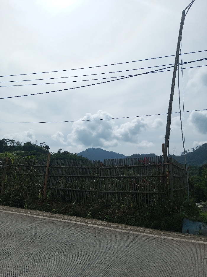 This image captures a daytime scene in Kandenuwara, Sri Lanka. In the foreground, a gray concrete road with horizontal texture runs diagonally from the lower left towards the center-right, bordered by a narrow strip of weeds and light foliage. Directly behind this, a rustic bamboo fence stretches horizontally across the midground. The fence consists of vertical bamboo poles fastened together, with some overgrown vegetation and scattered red blossoms visible within and around it. A single brown macaque is perched atop this fence, slightly to the left of its center. To the right of the fence, a tall, slender, weathered wooden utility pole rises vertically, leaning slightly to the left. Multiple dark electrical or communication lines are strung horizontally across the upper portion of the frame, passing by the utility pole. In the background, lush green forested hills and mountains are visible, receding into the distance. The sky above is partly cloudy, with a bright area in the upper left quadrant indicating the sun's position, and larger cumulus clouds clustered above the mountain range. No human figures are present.
