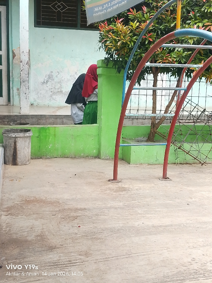 Two girls wearing hijabs stand near a green painted wall. One wears a black hijab, the other a red one. A climbing frame painted red and blue is nearby. A bush is growing behind the climbing frame. A bucket sits near the wall. The ground is concrete. A sign hangs above, attached to the building's exterior.