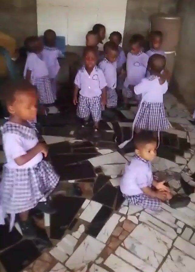 group of young children in what appears to be a classroom or similar indoor space. The children, ranging in age from toddlers to early elementary school, are wearing similar uniforms consisting of light purple shirts and plaid bottoms (skirts for the girls and shorts for the boys). There are around 10 children visible in the frame. They are milling around, some standing, some sitting, and some interacting with one another. The room has a tiled floor with a patterned design. There are a few pieces of furniture visible, including chairs stacked in the corner and a large cylindrical container. A calendar is hanging on the wall.