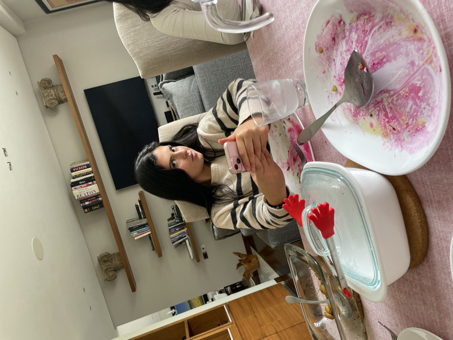 An indoor residential scene in Mexico City, Mexico, depicts a dining area. A female individual with long dark hair, wearing a beige and black striped sweater, is seated at a table, holding a pink-cased smartphone with both hands and looking slightly to her left. A second person is partially visible on the right. The table is covered with a textured pink tablecloth and holds multiple dishes containing remnants of a meal. These include a clear glass baking dish with food residue and a serving spoon, a white lidded casserole dish with red silicone "hand" tongs attached, and a white bowl containing pink and yellow food remnants and a spoon. A glass of water is also on the table. The background features a light gray wall with three wooden floating shelves displaying books and decorative elements, including a classical column capital. A large flat-screen television is mounted on the wall above a gray sofa. Further left, a wooden cabinet and a natural wooden sculpture are visible.
