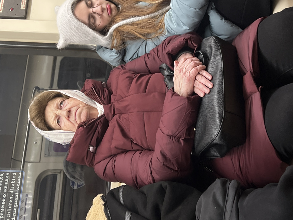 Inside a train car, a woman with fair skin and tired expression is seated, wearing a burgundy puffer jacket and a headscarf. Next to her, a younger woman sleeps, donning a light blue puffer jacket and a gray hat with ears. The older woman's hands rest on a black leather purse, her face conveying a mix of exhaustion and resignation. The background shows blurred train windows and informational signage. The lighting is slightly harsh.