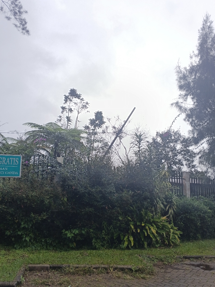 The image displays an outdoor scene under an overcast sky, located in Matopos, Zimbabwe. The foreground features a paved area interspersed with strips of green grass. Immediately behind this, a dense layer of diverse green vegetation, including shrubs and ferns, dominates the midground. To the left, a rectangular green sign with white text is partially visible, clearly displaying "GRATIS" at the top, followed by "AAN" and "CI GANDA" below. Further into the background, a variety of trees with different foliage densities are visible, some reaching high into the frame. On the right, a dark, vertical slatted fence is partially obscured by trees and bushes. A dark, slender pole or tree branch angles diagonally upwards into the sky in the upper central portion of the frame. No individuals or animals are present.