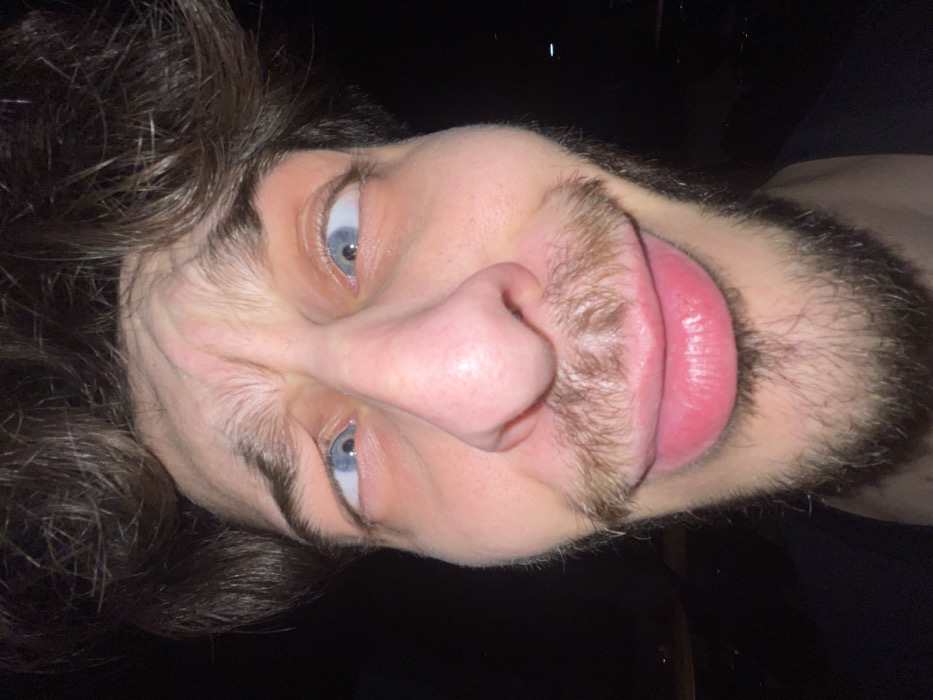 A close-up, upside-down selfie captures a male face with striking blue eyes, a prominent nose, and a thick beard. His lips are slightly parted, revealing a glimpse of his tongue. His dark, curly hair contrasts with his fair skin. The low lighting casts shadows, obscuring parts of the background and emphasizing the facial features. The expression is unconventional, possibly humorous.