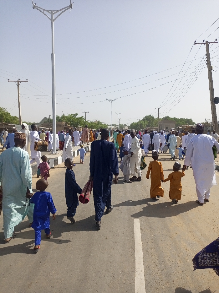 A group of people, mostly men and boys, are walking along a paved road in Maiduguri, Nigeria