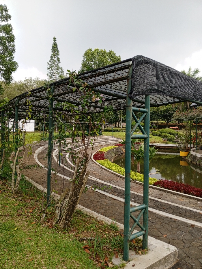 A metal structure with a black mesh top stands in a garden setting. Vines climb on the structure. A curving stone pathway leads along a pond, bordered with colorful flowers in red and yellow. Trees and additional greenery are visible in the background under an overcast sky. The scene suggests a tranquil and well-maintained park or botanical garden.