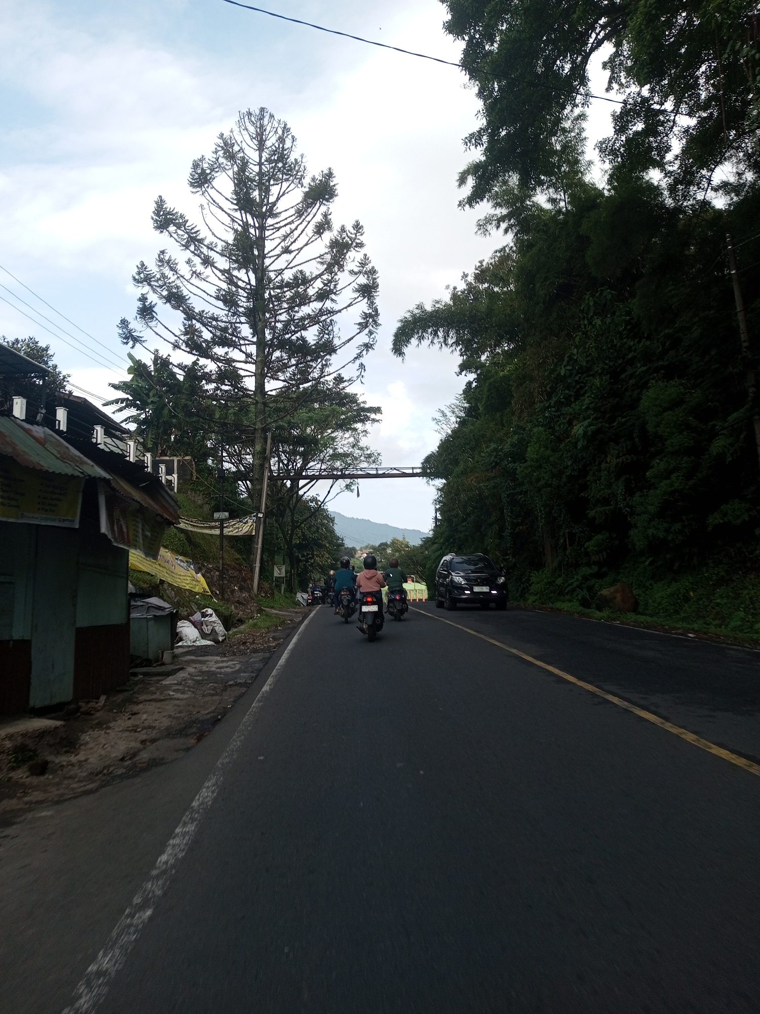 A road in Mya Sit Kaing Ywar Thit, Myanmar, shows several motorbikes and a black SUV driving along the road. On the left is a corrugated metal structure with visible signage, partially obscured. A tall tree stands near the road and structure. A pedestrian overpass spans across the road. The right side of the road is lined with dense green foliage. The sky is overcast.