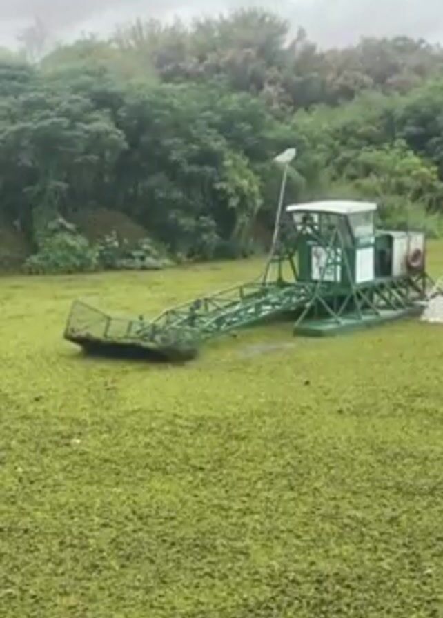 A green and white aquatic plant harvester sits in a body of water, completely covered in a green mat of plants. The harvester, a large boat-like structure, has a forward extending rake or scoop. It sits stationary in the middle of the dense vegetation. A stand of trees and shrubbery can be seen on a distant bank. The sky is overcast. Water is being emitted from the back of the harvester.