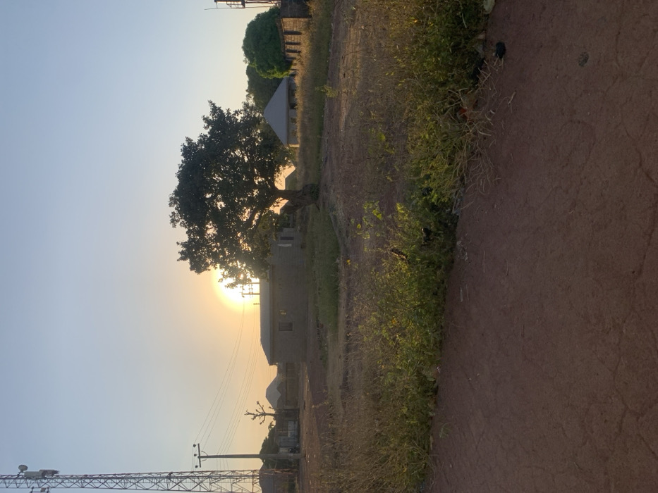 Sunset paints a rural scene. A large tree, silhouetted against the glowing sun, dominates the view. A simple building stands nearby. An unpaved road runs along the right, bordered by overgrown vegetation. A distant cluster of buildings and utility poles are visible under a clear, bright sky, contrasted by a communication tower to the bottom left.