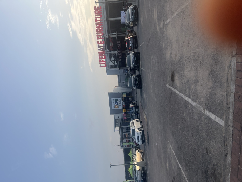 An outdoor scene shows a parking lot with multiple vehicles parked in rows. The buildings in the background have visible signs, including "LIFE MATE FURNITURE" and "NOVARE LEKKI". The sky is visible with light clouds. The image has a slight tilt, and the lighting suggests it was taken in the daytime, possibly early morning or late afternoon. The parking lot has white painted lines marking the parking spaces.