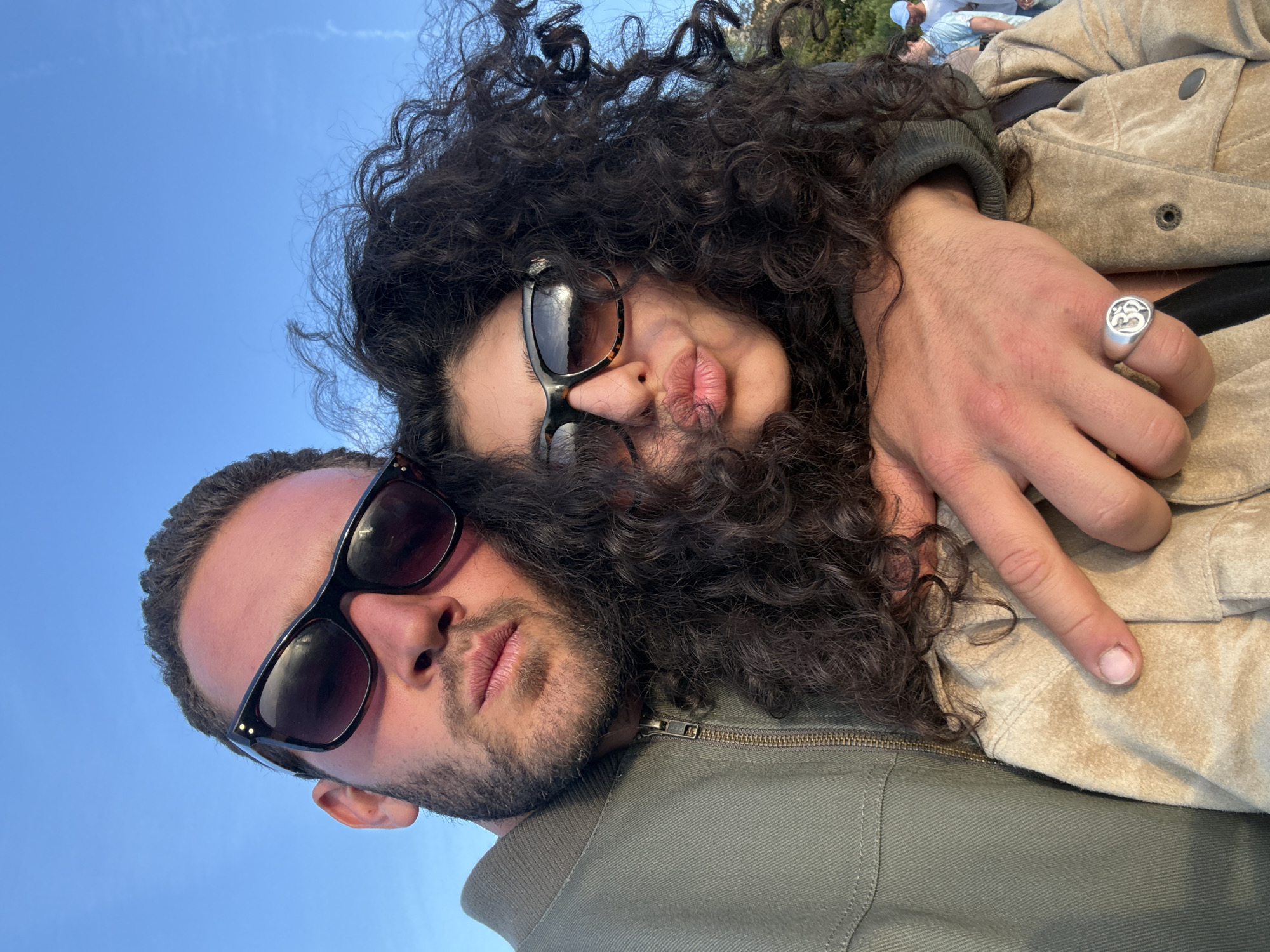 A low-angle selfie image features two individuals against a clear blue sky. The person in the foreground has short brown hair, a beard, and wears black sunglasses. The person behind has long, curly black hair and sunglasses. They are making a kissing face towards the camera. A hand wearing a ring with a symbol is visible, resting on the shoulders of the person with curly hair, who is wearing a light-colored jacket. The person in the foreground is wearing an olive green jacket. In the background, faint images of people and trees are visible. The location appears to be an outdoor area, possibly a park or elevated area in Los Angeles, USA.