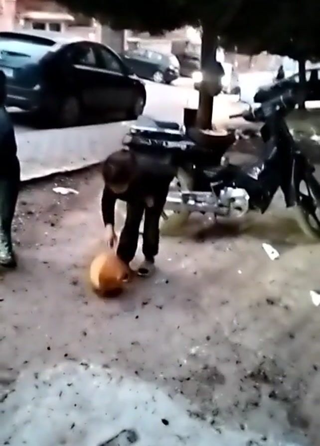 Outside on a cloudy day, a young child in a black outfit bounces an orange basketball on a grey surface that has scattered debris. There are two dark cars parked on a curb next to the child. There is also a black moped parked to the right of the child. Another child is partially visible on the left of the screen. A tree is planted in the background.