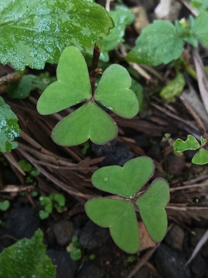 The image captures a ground-level close-up of vegetation in Unknown, Cambodia. Two prominent bright green trifoliate plants, consistent with Oxalis species, are central subjects. The upper plant displays three heart-shaped leaflets. The lower plant, positioned below it, also features three heart-shaped leaflets, with a single clear water droplet visible on its upper-left leaflet. Surrounding foliage includes a larger, wet, dark green leaf in the upper left and smaller green sprouts scattered across the background. The ground consists of a dense layer of dry, brown, elongated plant debris, possibly pine needles or dried grass, interspersed with dark, smooth pebbles and exposed soil. The environment appears moist.