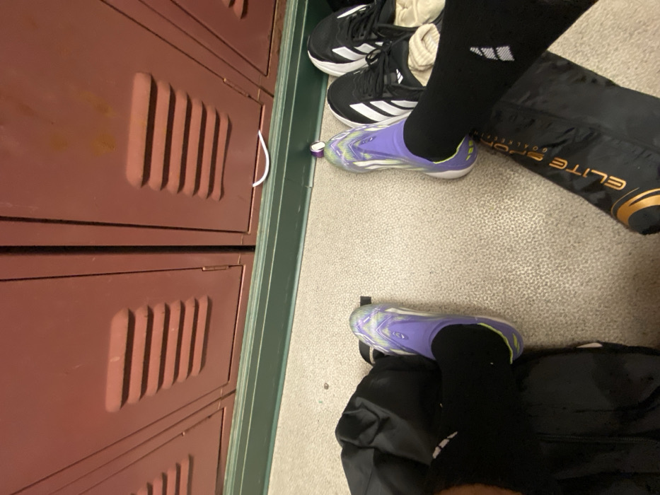 The image displays an indoor scene, likely a locker room or hallway, in the Town of Colonie, United States. The perspective is low, focusing on the floor and the base of a locker wall. In the foreground, the lower legs and feet of two individuals are visible, resting on a light-colored, textured floor. On the left, a foot is clad in a purple and light green athletic shoe/cleat, paired with a black compression sock. A black athletic bag rests beside it. On the right, another foot wears an identical purple and light green athletic shoe/cleat with a black compression sock. Next to this foot, a pair of black Adidas sneakers with white stripes and light-colored socks are positioned. A black and orange bag, labeled "ELITE SPORT GOALKEEPING," is partially visible near the right foot. A small purple, cylindrical object lies on the floor between the purple shoes. The background consists of a row of reddish-brown metal lockers, each featuring horizontal ventilation slats near the bottom. A dark green baseboard separates the lockers from the floor. A thin white wire or cord is present on the floor directly in front of the lockers.