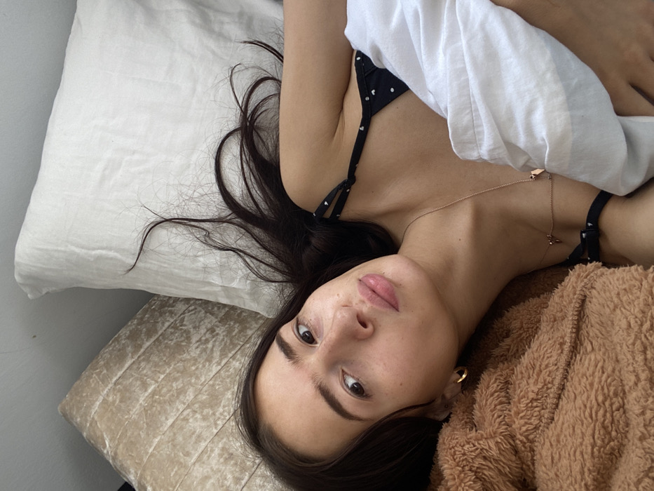 The scene is set indoors in Welwyn Hatfield, United Kingdom. A female individual with dark hair is depicted lying on her back, propped by pillows, looking directly at the viewer. Her dark hair is splayed across a white linen pillow. She is wearing a black camisole-style top adorned with small white heart-shaped dots. A thin gold chain necklace with two small heart-shaped pendants rests on her chest. A single gold hoop earring is visible in her left ear. Her body is partially covered by a white sheet or duvet. To her left, a brown, textured, possibly faux fur blanket or pillow is visible. Another textured, light-colored pillow is present in the upper left background.