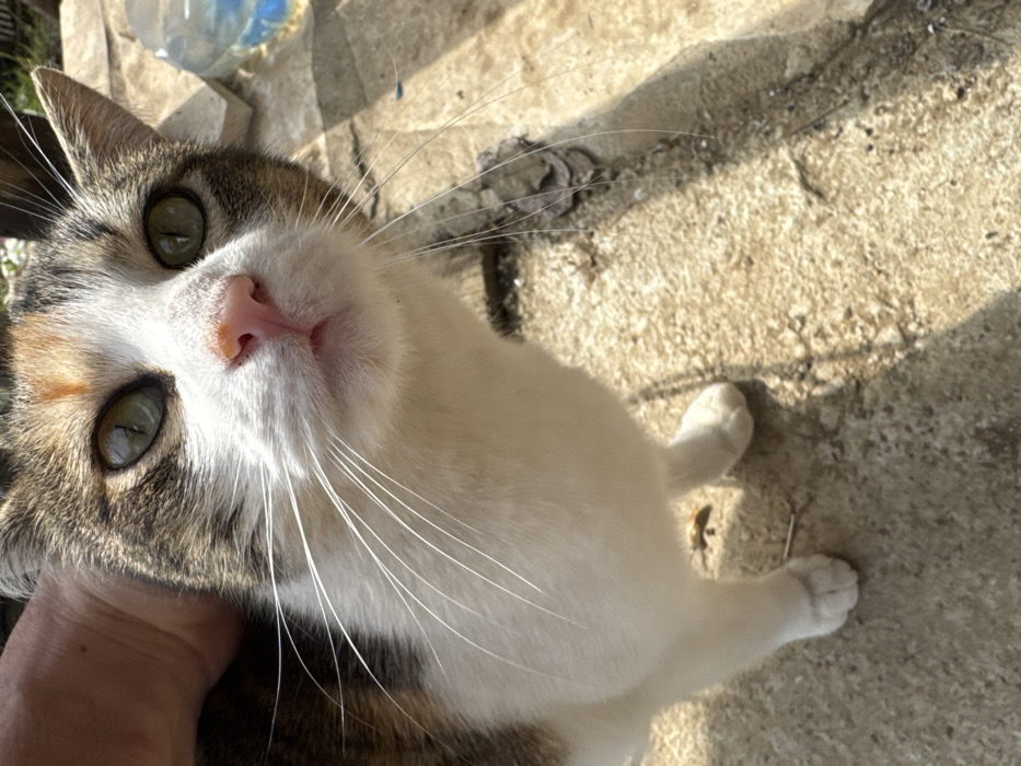 An image taken in Berkovitsa, Bulgaria, depicts a calico cat with predominantly white fur, interspersed with brown, black, and orange patches on its head and back. The cat possesses large, light green eyes with prominent dark pupils and a small pink nose. Numerous long, white whiskers extend from its muzzle. A human hand with light skin tone is visible on the upper left, positioned against the cat's head and neck area, suggesting physical interaction. The cat is looking upwards and slightly to its right, towards the camera. Its body is partially visible, showing white fur on its chest and legs as it stands on a light-colored, textured ground surface, likely concrete or stone paving. Strong directional sunlight illuminates the scene, creating distinct shadows on the ground behind and to the right of the cat. In the out-of-focus background, a blue plastic bottle or container is partially visible, along with other indistinct objects and textures.