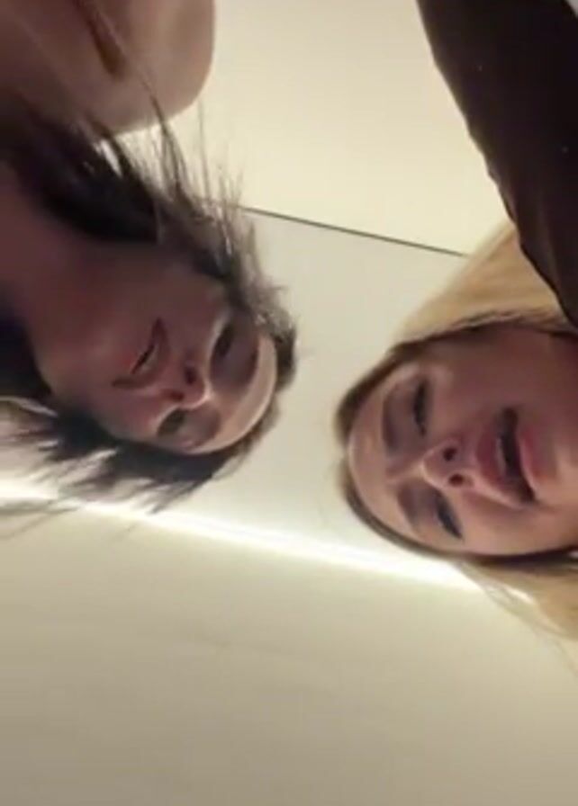 two women looking down into the camera. The woman on the left has long, dark hair and the woman on the right has blonde hair and is wearing a brown top. The background is a white surface. The women are both smiling and talking, with the blonde woman appearing to mouth words.