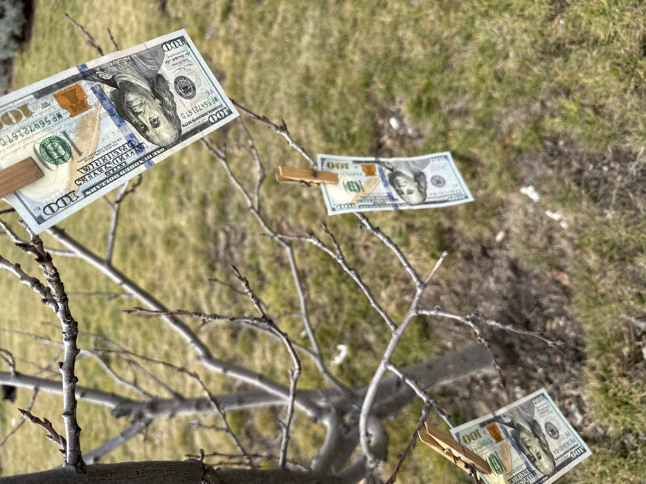 The image displays a bare deciduous tree located in Vagharshapat, Armenia. Three United States one-hundred dollar bills are individually secured to the tree's branches using wooden clothespins. One bill is clipped to an upper-right branch, a second bill hangs from a central branch, and a third is attached to a lower-left branch. The tree's branches are leafless, indicating a dormant state. The ground visible beneath and around the tree is covered with sparse, mixed green and brown grass. No people or other active subjects are present in the scene.