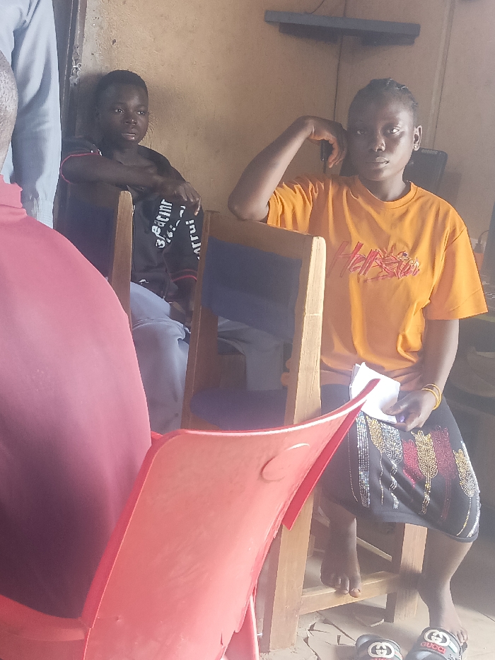 The image displays an indoor scene in Akwanga, Nigeria, featuring five individuals within a room with light brown walls and an unpaved, earthy floor. In the immediate foreground, the back and left shoulder of a person wearing a red/maroon top are visible, seated in a red plastic chair. To the left, a young male, appearing pre-teen, is seated on a wooden chair with a blue upholstered backrest. He wears a dark long-sleeved shirt with white text ("eatmr", "arrru") and light-colored trousers, with his arms crossed, looking to the right. To the right, a young female, appearing teenage, is seated on a similar wooden chair. She wears an orange short-sleeved t-shirt with a red graphic design, a dark skirt adorned with multi-colored feather-like patterns, and a yellow wristband on her right wrist. Her right arm is bent, with her hand near her head, resting on the chair's backrest. Her left hand holds a small stack of white papers and a dark pen. She looks directly at the camera. Her feet are bare, and a pair of black slides with white Gucci branding are on the floor in front of her. A partial view of a fifth individual in light blue/grey clothing is visible in the far left background. A dark, flat object is mounted on the wall in the background above the young female.