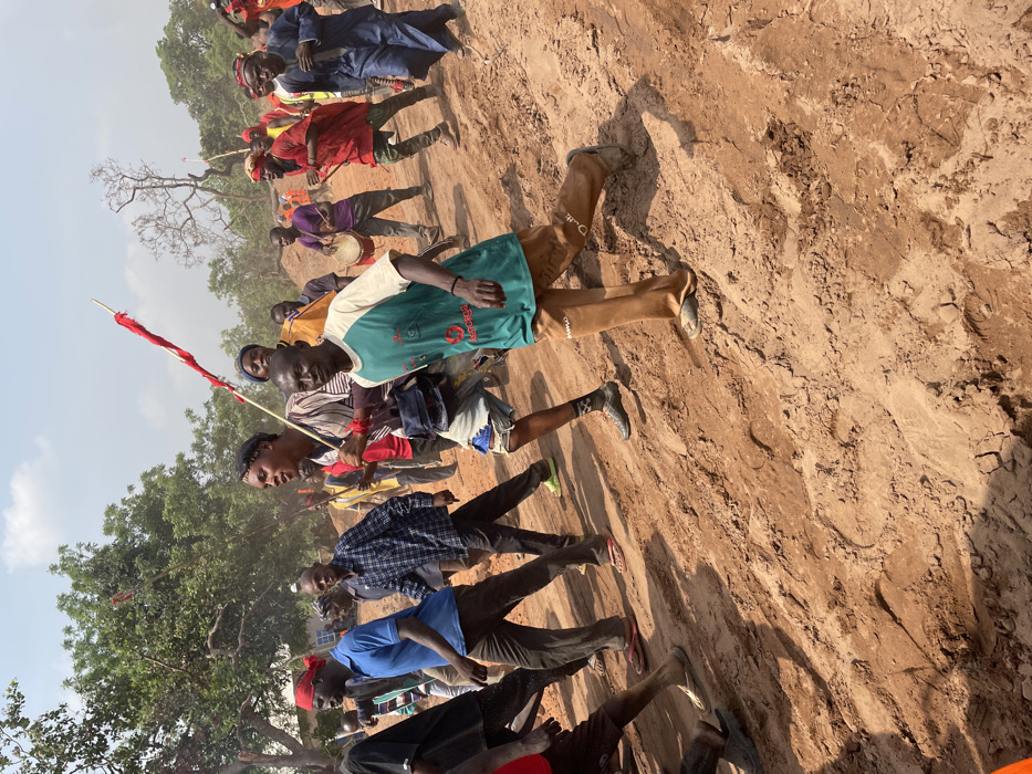 A line of people walks along a dirt path outdoors. They wear various clothing, from casual t-shirts and shorts to more formal attire. Some carry sticks topped with red flags, and one man plays a drum. The scene appears to be a procession or event, taking place under a clear sky with trees visible in the background. Dust rises from the ground, suggesting dry conditions.