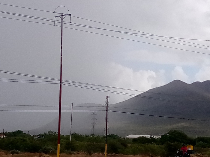 The image depicts a semi-rural landscape in El Dátil, Venezuela, under an overcast sky with visible patches of lighter clouds. In the foreground, a tall, slender red utility pole with a yellow base supports multiple power lines via a cross arm and an arcing metal structure. Parallel power lines traverse the upper and middle sections of the frame. To the right of the prominent red pole, a thinner red utility pole is partially visible. Further back, a metal lattice transmission tower stands to the left of a larger communication tower with multiple antennae. The mid-ground consists of dry, sparse vegetation, including bushes and tall grasses. Through this vegetation, a light-colored building with a grey roof is visible at the base of a large, dark, undulating mountain range that dominates the background. On the far left, indistinct structures and a light-colored SUV are partially obscured by foliage. In the lower right corner, a person wearing a red garment is seated on a dark motorcycle, partially concealed by vegetation.