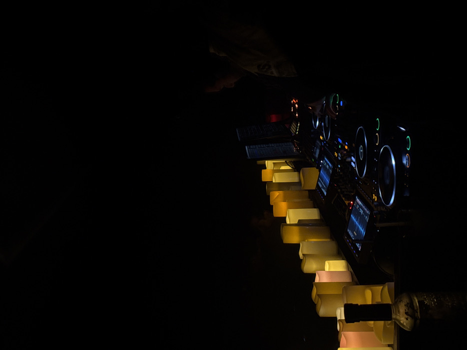 The scene depicts a dimly lit indoor event space in Monterrey, Mexico. A DJ setup occupies the middle ground, featuring at least two Pioneer CDJ-style media players with illuminated platters and screens displaying audio waveforms, alongside a central mixer. Various buttons and indicators on the equipment glow with blue, green, and red LEDs. Behind the DJ equipment, two vertical computer monitors are visible. To the left of the equipment, a linear arrangement of approximately 20-25 artificial cylindrical candles, varying in height, emits a warm yellow-orange light, serving as the primary illumination for the foreground. In the lower left, a clear glass bottle with a dark neck and cap rests on a surface, reflecting some light. On the right side, partially obscured by shadow, a person is visible from the chest up, with their right arm extended towards the DJ equipment, actively operating the controls. They appear to be wearing a light-colored garment with a dark emblem or patch on the right shoulder. The background is completely dark, indicating a lack of additional lighting.
