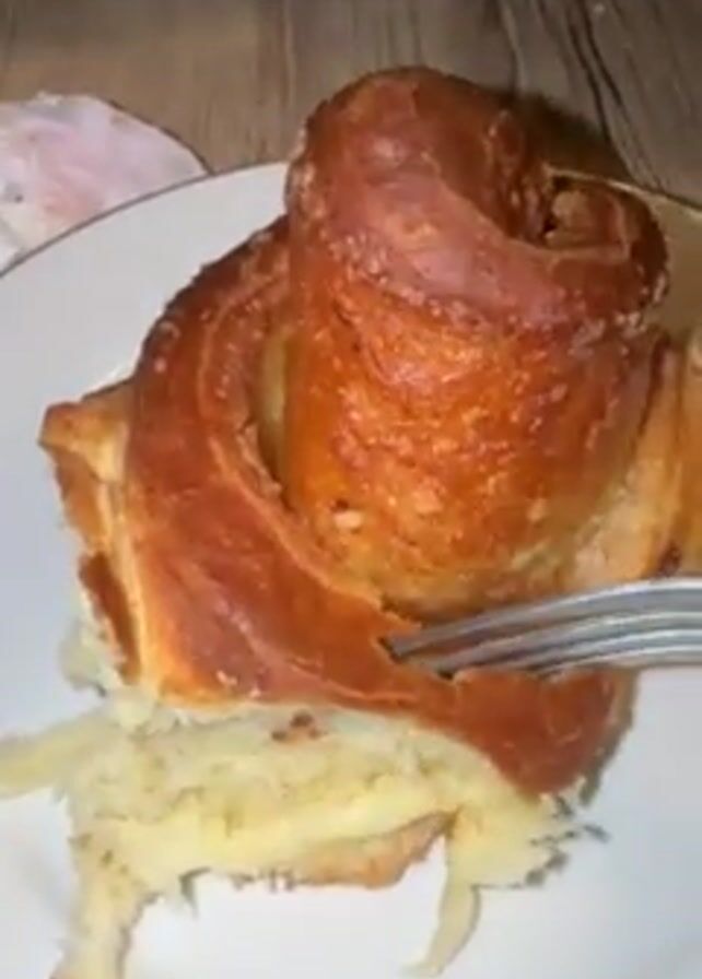 A fork is used to break apart a roll on a white plate. The roll is golden brown and appears to be made of layers. A light-colored interior is revealed as the roll is broken apart. A wooden-look surface and a white bowl are in the background.