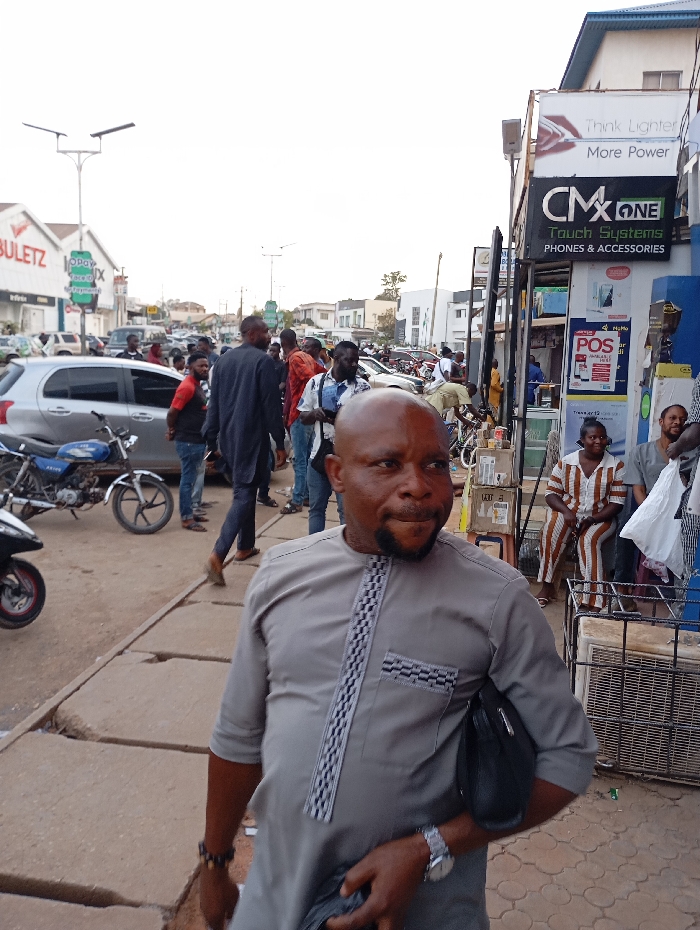 A street scene depicts a man in a gray shirt standing on a sidewalk, with a black bag over his shoulder. Behind him, a group of people stand near parked cars and motorcycles. A "BULETZ" sign is visible in the background, as well as signs for "CMX ONE" phones and accessories. The sidewalk is cracked and worn.