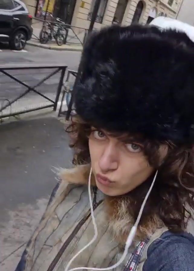 A person wearing a black fur hat, a fur-trimmed vest over a denim jacket, and white earphones walks on a city street. The person makes a pursed lip face and then sticks out their tongue at the camera. Buildings and parked cars line the street.