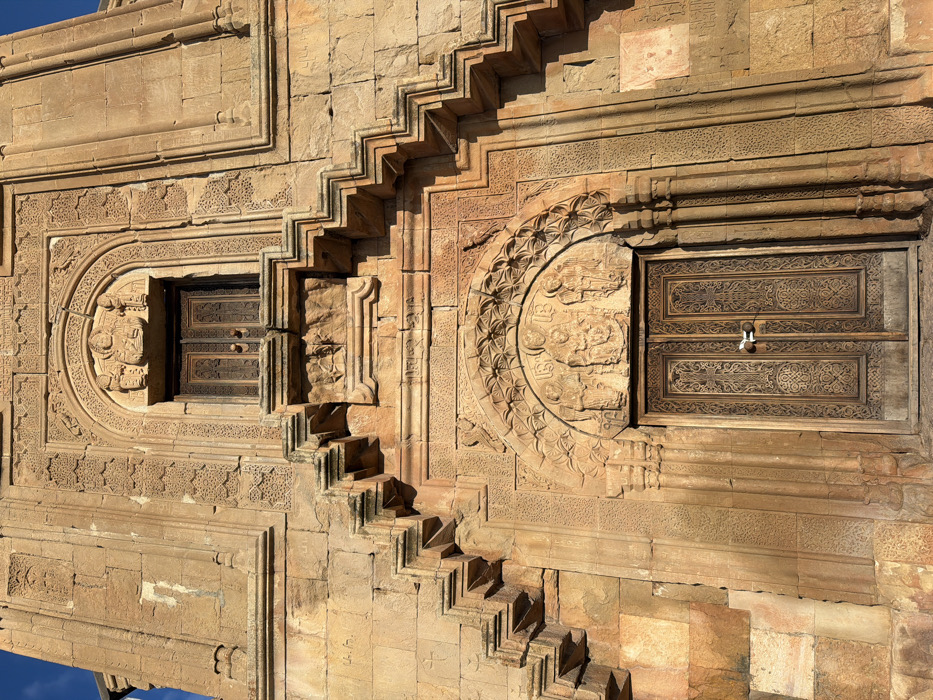This image depicts the sunlit stone facade of Surb Astvatsatsin Church (Holy Mother of God Church) in Areni, Armenia. The structure is composed of light brown to reddish-brown cut stone blocks. At the lower center, a pair of dark brown wooden double doors forms the main entrance. These doors are intricately carved with geometric patterns and large crosses, and they are secured at the handles by a white, rope-like material. Above the doors, within a semicircular arch, a stone tympanum features a relief carving of three figures: a central seated figure holding a child, flanked by two standing figures. Inscriptions are present above these figures. The archway itself is deeply recessed and adorned with multiple layers of relief carvings, including star-like geometric and floral motifs. Directly above the lower entrance, a smaller, similarly arched opening contains a smaller pair of dark wooden doors or shutters. Above these, a less distinct stone tympanum carving shows a central figure flanked by two smaller elements. This upper archway also features detailed relief carvings. Prominent stepped, zig-zagging stone projections and recesses extend horizontally across the facade, creating distinct shadow patterns under the bright daylight. The entire stone surface is extensively covered with additional relief carvings, including geometric designs, crosses, and foliate patterns. Vertical pilasters with carved capitals frame various sections of the facade. A clear blue sky is visible in the upper corners of the image.