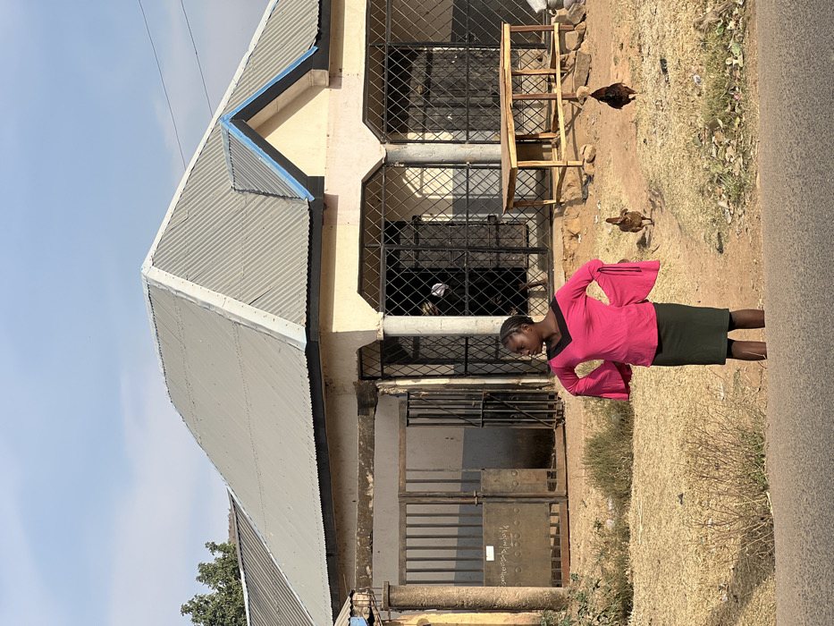 A woman in a pink shirt and dark skirt stands outside a two-story building with a corrugated metal roof. The building has barred windows and a gated entrance. A wooden structure sits in front of the upper windows. Two chickens are visible on the grassy ground between the building and the roadside. The image is rotated sideways.